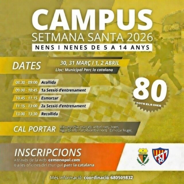 El Campus de Semana Santa 2026 del CF Barceloneta es la oportunidad perfecta para que niños y niñas de 5 a 14 años vivan unas vacaciones activas, dinámicas y llenas de fútbol en el Municipal Parc de la Catalana. Entrenamientos adaptados por edades, trabajo técnico, coordinación, toma de decisiones y, sobre todo, ganas de mejorar disfrutando.